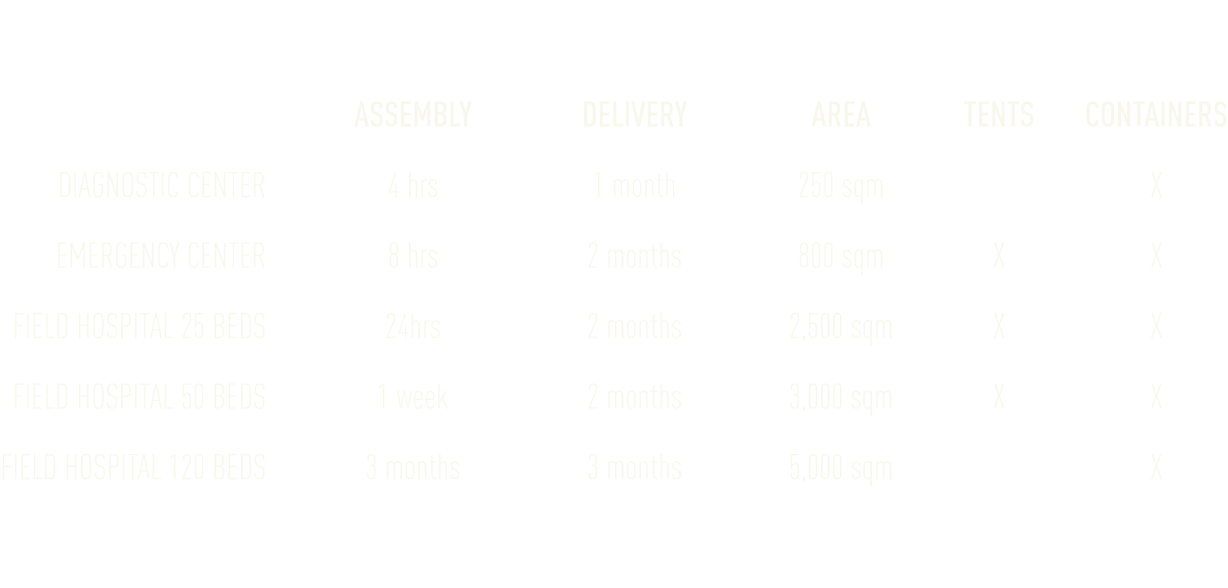 We offer several modular solutions, from a small examination centre up to a 150-bed hospital.